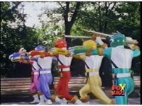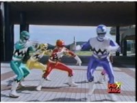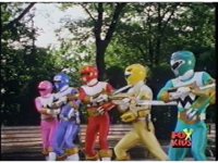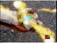 The Rangers pose some more, then rush forth, glowing, then merging into one bright ball of yellow energy. It slams into Maronda's approaching Snake Cycle, is unable to rip through it, causing the ball to revert back into the Rangers, depositing them roughly on the ground. |