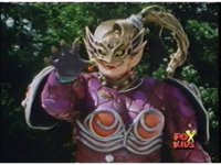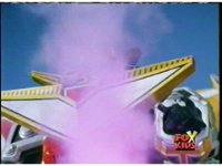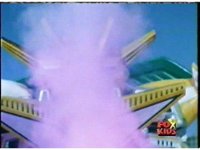 Maronda begins to motion her hands and arms about, suddenly causing a purple mist that sprays Galaxy Megazord in the face, Blue in his cockpit reacting to it. |