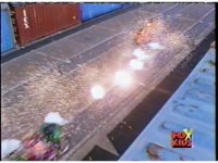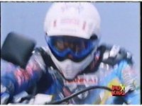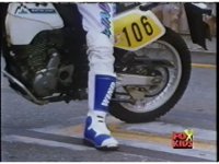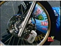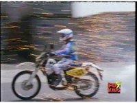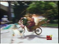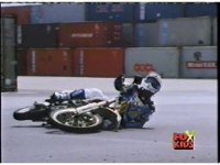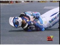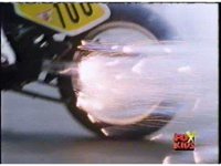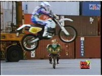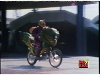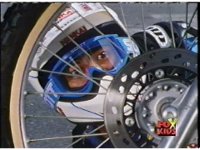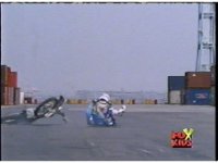 Snake Cycle fires some more, spark bursting Colby's bike, causing him to lose his balance, the bike falling on its side, skidding along the ground, and Colby rolls off roughly. |