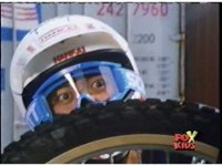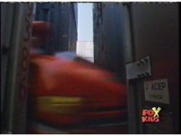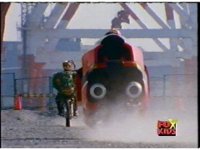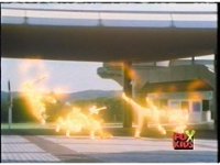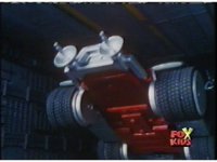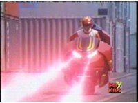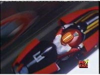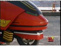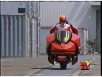 Red nod-talks in the Red Capsular Cycle, which races down a green energy tunnel, closing up around the Ranger and becoming engulfed with flames as it drives straight at us. |