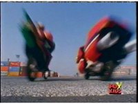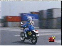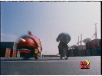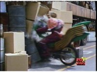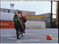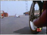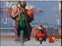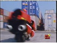 The Rangers fall to the ground next to each other, Maronda driving toward them, as Red lies there, helpless. Suddenly, Colby on his motorcycle leaps in and kicks Maronda, causing her to crash into some boxes, before he lands and skids to a stop. |