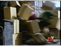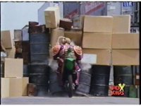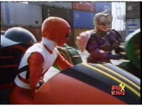 Red recovers, talking, just in time for Maronda to drive back through the Rangers, sparking each of them on the way by. Red gets back up again, and Maronda slams her Cycle into him, sending him flying into a shipping container. The other four Rangers are also knocked into containers. |