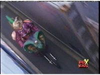 Red catches up to the Snake Cycle, pulling alongside Maronda, and kicking at her. |