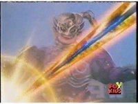 Galaxy Megazord watches as Maronda appears, closer and closer each time. So it slashes its Saber at her, but she vanishes and reappears behind or beside it each time it tries. |
