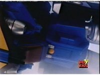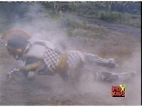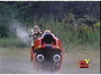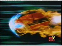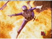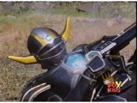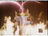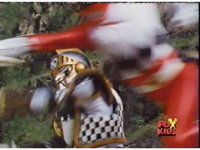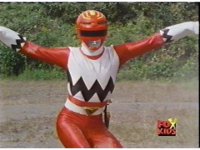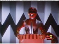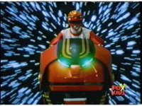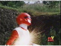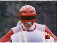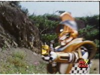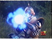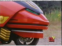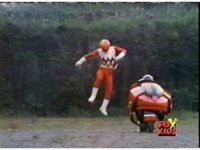 Red nod-talks in the Red Capsular Cycle, which races down a green energy tunnel, closing up around the Ranger and becoming engulfed with flames as it drives straight at us. |