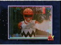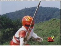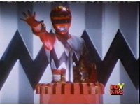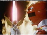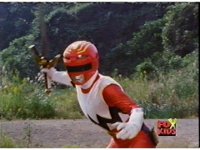Red Galaxy Ranger charges up his Quasar Saber with red energy, flames surrounding him, before he slashes it forth. |