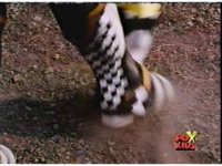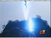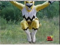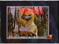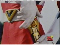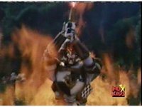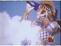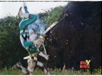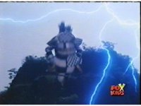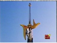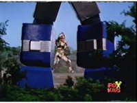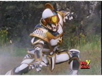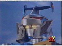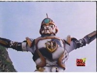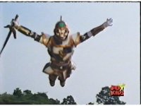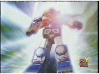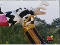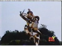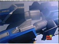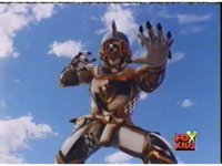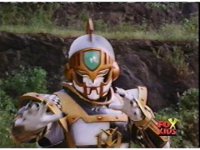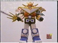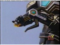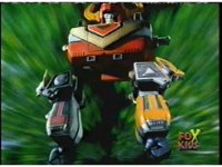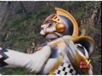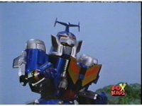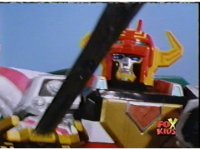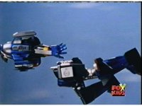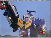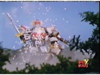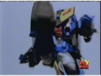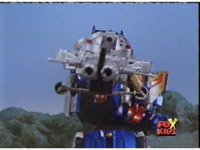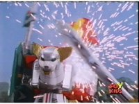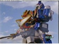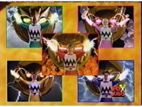 The head and horns pop out of the Lion section as it floats up, Wild Cat & Lion becoming arms, as all five Zords come together to form the Galaxy Megazord, with its saber forming in a crackle of electricity. |