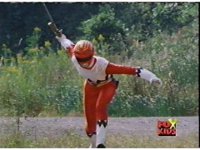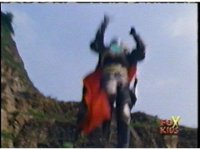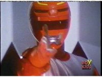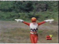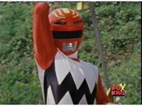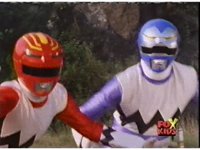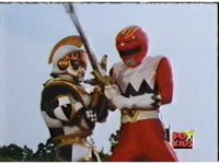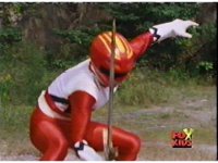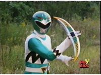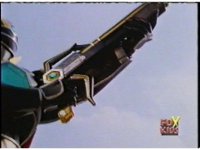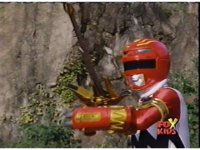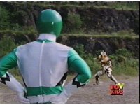 Chameliac poses identically to Red with his own Quasar Saber, prompting Red to resheathe his Saber, then pose like Green Ranger. |