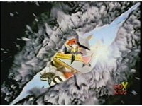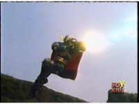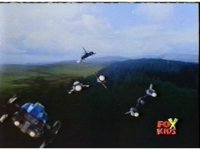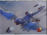 The Stratoforce Zords fly forth from Zenith Carrierzord's open mouth, swooping about, then getting into formation, Phoenix Galactabeast briefly visible, as they begin to get into component mode. |