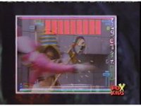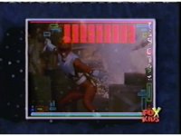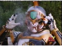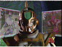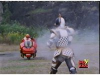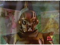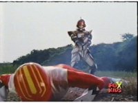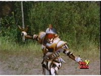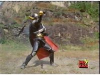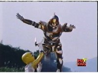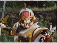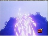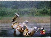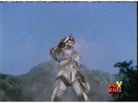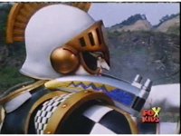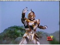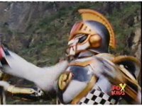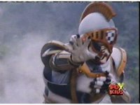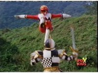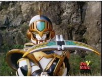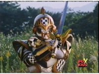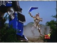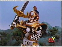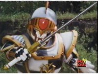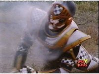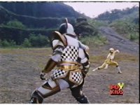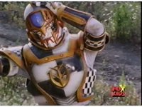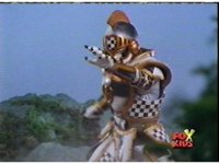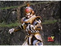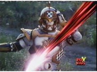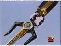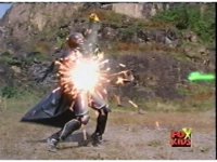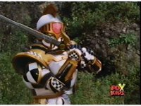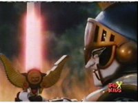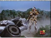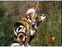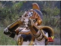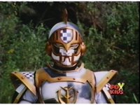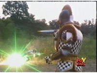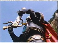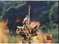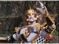 Galaxy Megazord charges at Chameliac, who changes his indicator to white, and pulls out his own Megazord Saber. They clash blades, but he gets several sparkily slashes in on GM. |