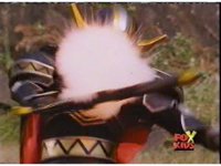 Chameliac charges up his Quasar Saber with red energy, flames surrounding him, before he slashes it forth, sparkily slashing Red down. |