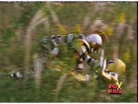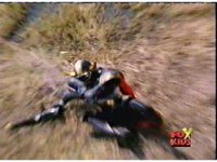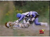 Green flips over, bounces off a tree, and fires Transblaster. |