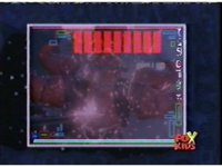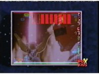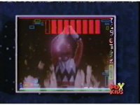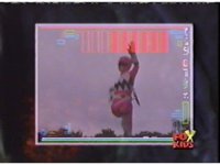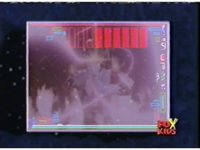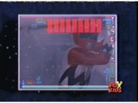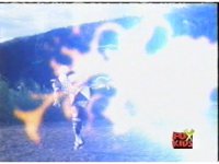 Chameliac replies, then leaps up, changes his Blaster to Sword, aims toward the downed Magna Defender, and does three quick somersaults in midair, the final one with his charged sword slashing forth, sparkily slashing MD until a superimposed explosion erupts, knocking him back. |