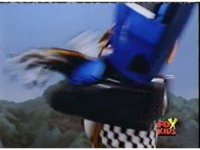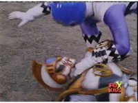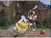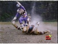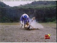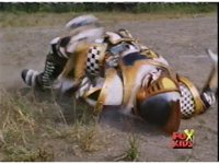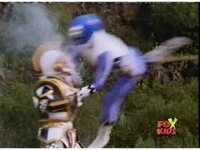 Blue tackles Chameliac down, then drags his body on the ground for a bit, before releasing and posing like Yellow. |