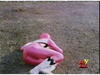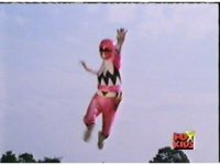 Pink leaps up, bounces off a tree, and makes a fierce pose in midair. |