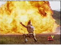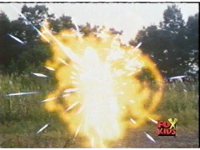 Chameliac rushes forth, converts into a ball of golden energy, and rips through the Rangers sparkily, coming out the other side, landing and posing, as they collapse and explode massively. |
