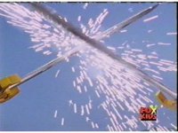 Magna Defender jumps up, changes his blade to Magna Blaster mode, cocks it, then fires green blasts in the air. |