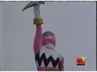 Pink lands atop Wild Cat, then raises her Transdagger high into the air. |
