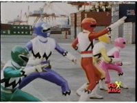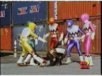 All of the Rangers, and Magna Defender, take on multiple Swabbies at once. |