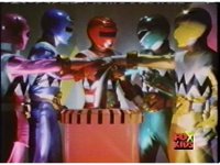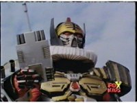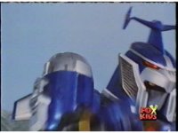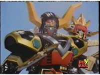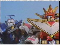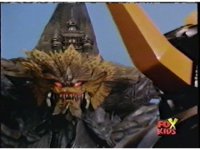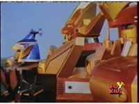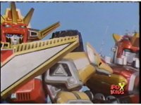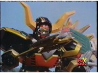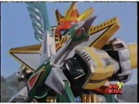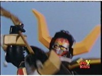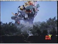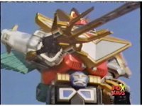 The head and horns pop out of the Lion section as it floats up, Wild Cat & Lion becoming arms, as all five Zords come together to form the Galaxy Megazord. |