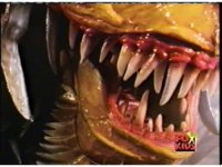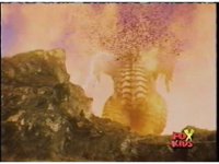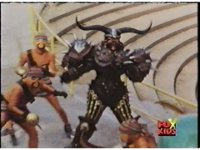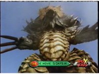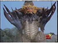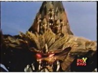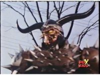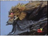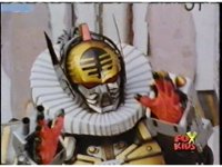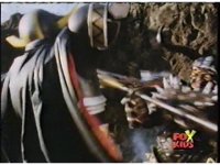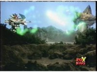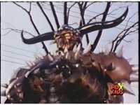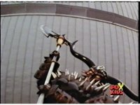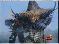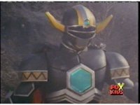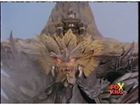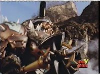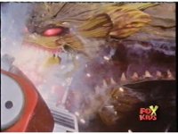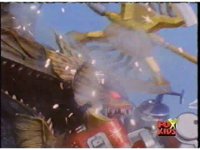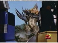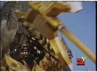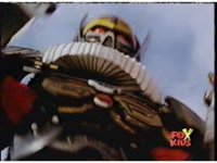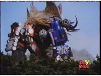 Grunchor opens his huge mouth and bites sparkily upon Centaurus' head, Stratoforce struggling to free his fellow Megazord, when the Defender Axe slices in, bonking Grunchor down, freeing Centaurus as Galaxy Megazord also steps in to protect him. |