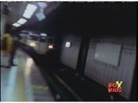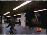 The subway train keeps running despite the carnage going on around it, blocks and debris falling down as people run about. |