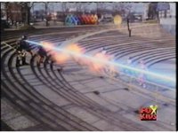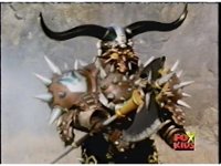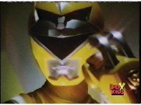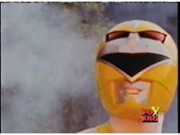 Zoom in on Yellow, talking angrily with a raised fist, Barbarax replies, then fires an eyebeam at the four Rangers, spark bursting them down. |