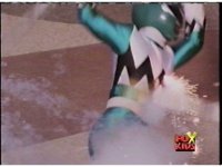 Green kicks into a Swabbie, bounces and flips over, kicks into two more, then launches forth, grabbing one as he soars. |