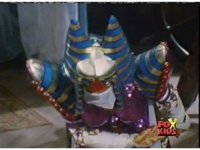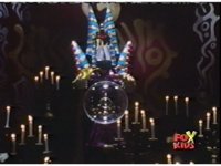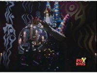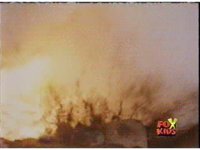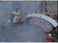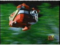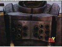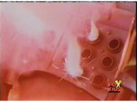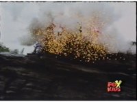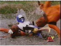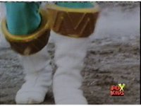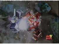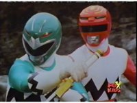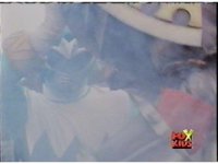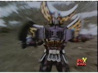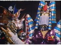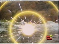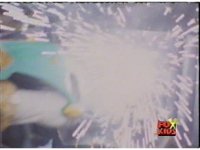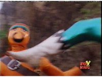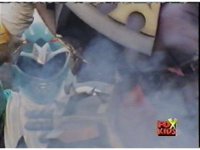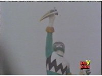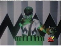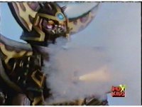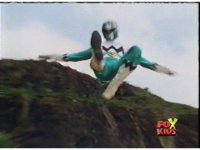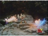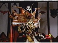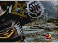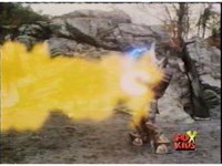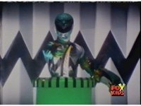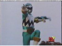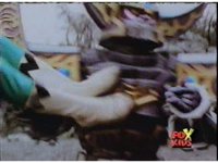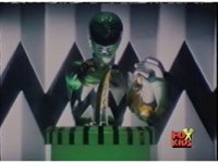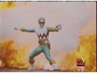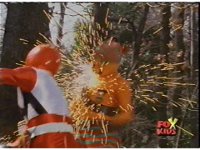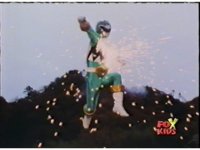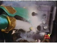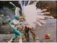 Nightmare talks, then opens his chest plate again, which Green watches closely. The monster fires sparkily upon the Rangers, but Green rushes through the smoke, and leaps forth, getting sparkily blasted, but punching his claw forth, smashing right into his chest barrels explosively. |