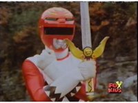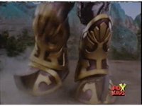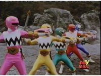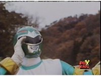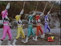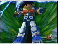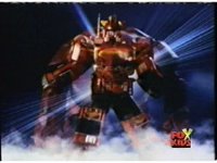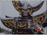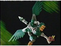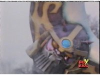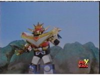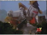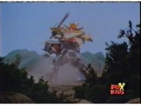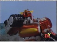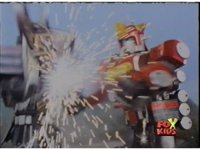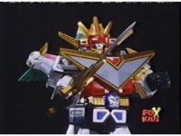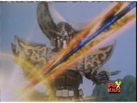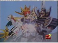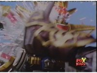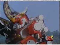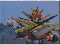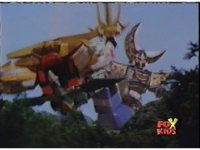 The head and horns pop out of the Lion section as it floats up, Wild Cat & Lion becoming arms, as all five Zords come together to form the Galaxy Megazord, with its saber forming in a crackle of electricity. |