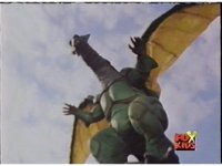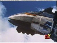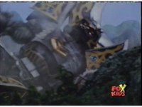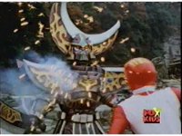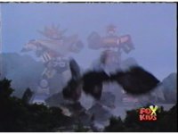 Meaty chunks of debris fall down before Galaxy & Centaurus Megazords. |