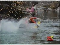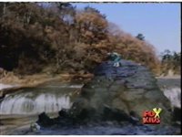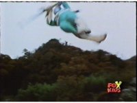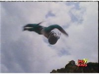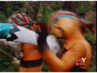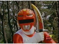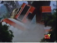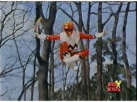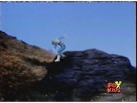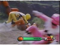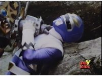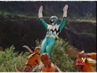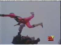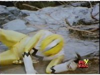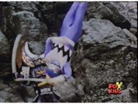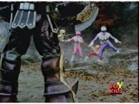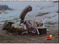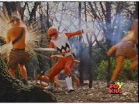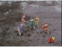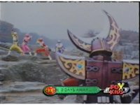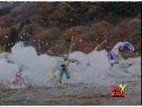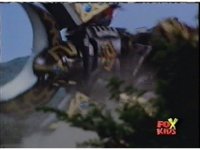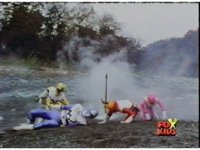 Red falls, his teammates regroup around him, Nightmare talks, then opens up his chest plate, revealing multiple gun barrels within. The Rangers dive over the side as he fires, exploding just behind them as they fall into the river. |