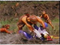 Blue takes a Swabbie down into a puddle, footsweeps one passing by, then takes another one down into the water, before kicking a fourth Swabbie. |