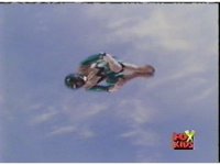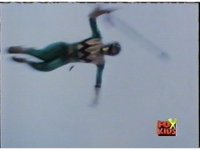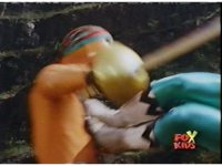 Green does a flying kick into a Swabbie, flips over, kicks two more, bounces off, and corkscrews into another, knocking it into two other Swabbies. |