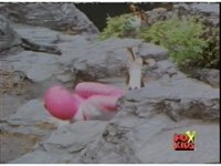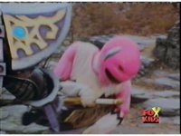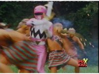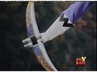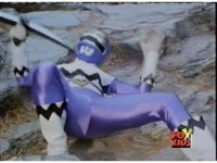 The four Rangers unsheathe their Quasar Sabers, then rush in at Nightmare, who cleaver strikes each sparkily, flipping Pink over onto some rocks. |