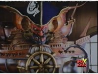 Close on Captain Mutiny, talking, then stepping forth, raising hook, and talking more. |