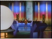 Distant shot beside/behind Viewing Globe, as Alpha stands in middle of console area, turning to our left briefly, raising arms while facing our way and talking. |