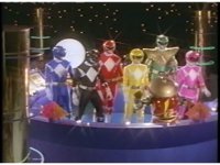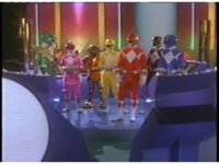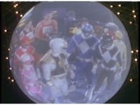 All six Rangers stand in console area, watching Viewing Globe, Green turning to Alpha as he talks. |