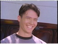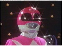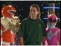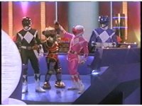 Tommy sullenly smiles between Red Ranger wearing the Dragon Shield and Pink Ranger. |