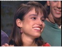 Close on Aisha, facing our right, smiling as she turns her head sharply to our slight left. |