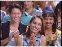 Adam, Kimberly, and Aisha applaud and smile in crowd of teens. |