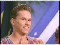 Rocky stands in Youth Center, grinning stiffly and clapping. |