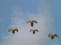 ![]() A trio of Magnavore Jet Fighters fly to our left through the clouds. |