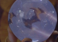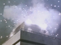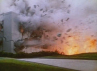 ![]() Close on upper roof area of building, as the antenna at the top spark bursts, quickly causing the rooftop structure below it to explode into debris. |
