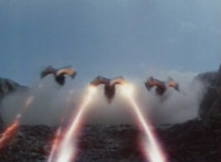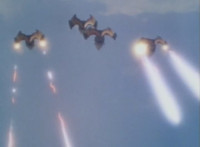 Three Magnavore Jet Fighters fire lasers while swooping down to our right. |