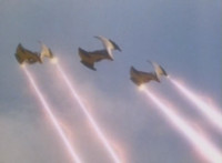 Four Magnavore Jet Fighters fire while swooping downward. |