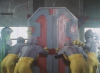 Zoom out from the accelerator machine as Green & Red fight Scabs in front of it. |