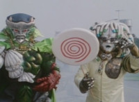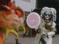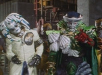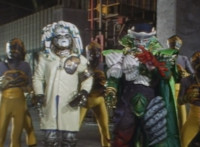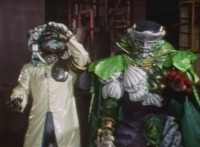 Typhus at his side, Noxic holds up a big lollipop and speaks while gesturing it, using the sucker to bait Fire Cat into following him, when Green & Red make the scene, posing battle ready. Typhus orders the Scabs to attack them, so Green & Red begin to fight the oncoming gang of goons. |
