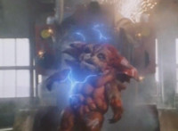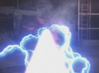Struck by a blue beam, Fire Cat writhes, crackles, sparks, and finally collapses. |