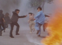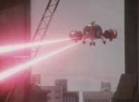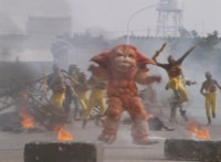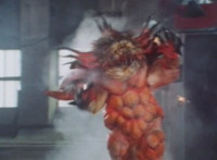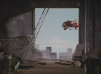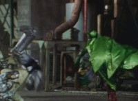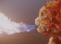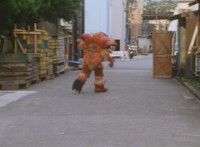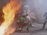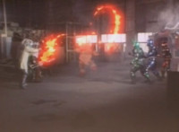 Shortened heavily to remove some fleeing Japanese workers at start; cuts follow-ups of Fire Cat spewing flames at those chasing him. |